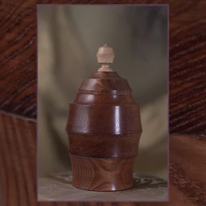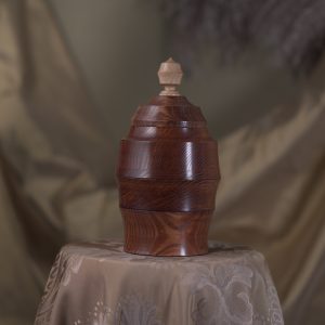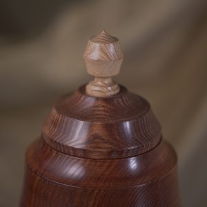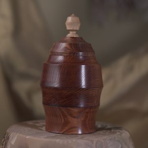 This exquisite pet urn will do the justice to your special friend and remind you of them in a dignified way, whenever you look back at it. Handmade of superb Ash wood, the urn delights with its stunning pattern that remains visible through the richly burgundy stain (not strictly brown as it may seem). The artisan shape, pointy like a gem stone, matched with a similar but light lid ornament made of Robinia wood shines subtly thanks to our natural matt-finish.