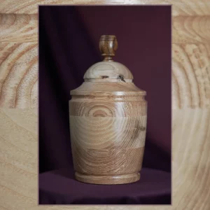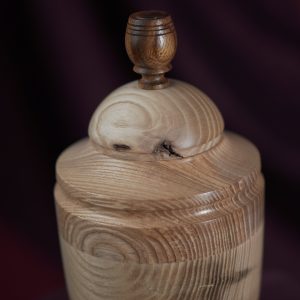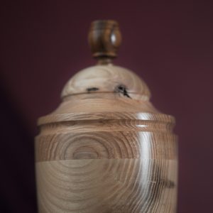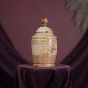 This exquisite pet urn will do the justice to your special friend and remind you of them in a dignified way, whenever you look back at it. Handmade of solid Olive Ash wood, the urn delights with its naturally eye-catching pattern and knot features. The modern artisan shape has been surmounted with a spectacular lid ornament made of a fine piece of exotic wood, and completed with the subtle shine of our natural matt-finish.