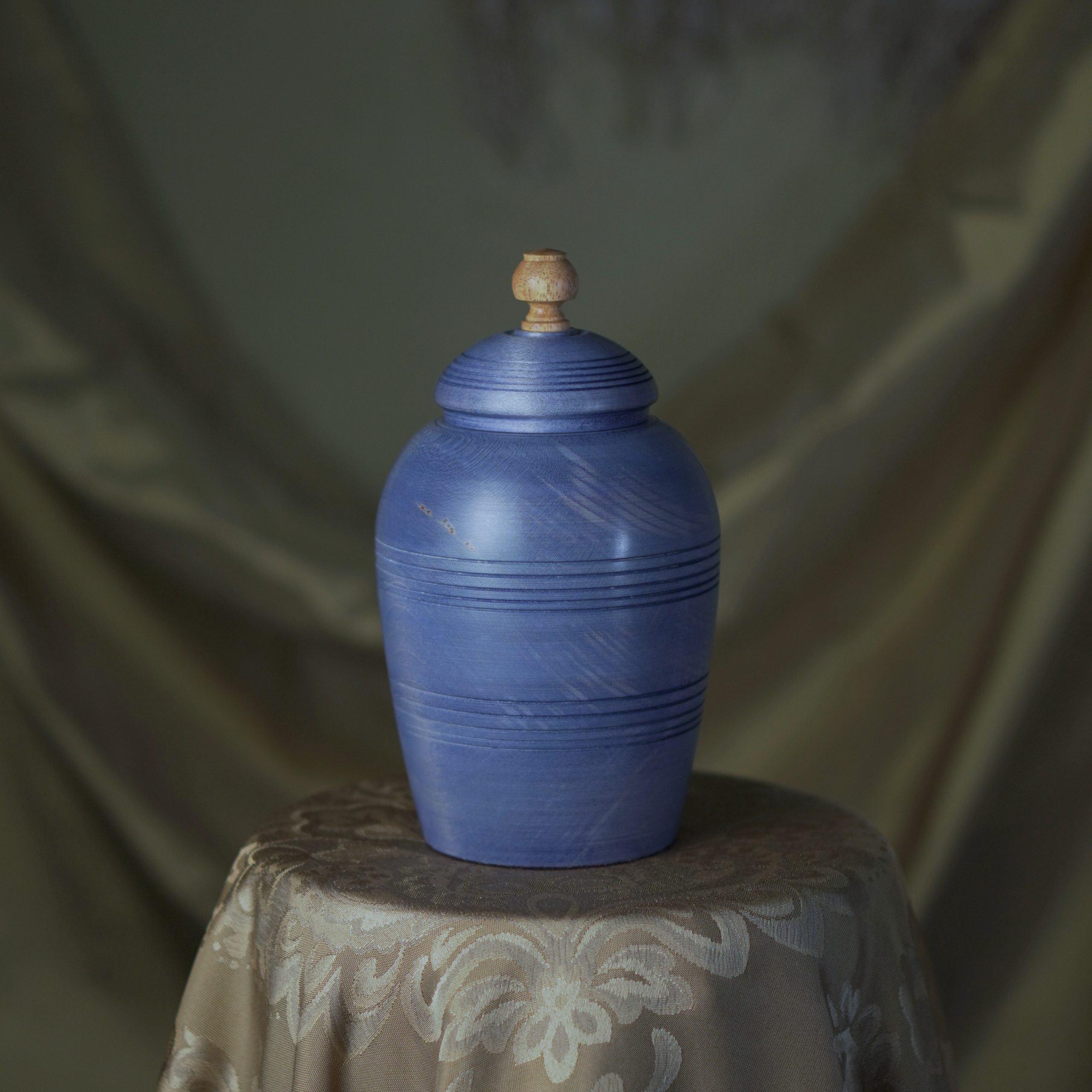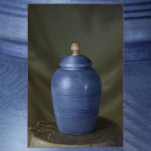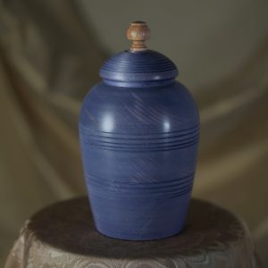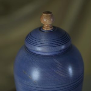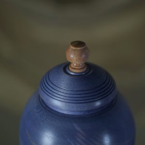 This stunning pet urn will do the justice to your special friend and remind you of them in a dignified way, whenever you look back at it. Handmade of naturally light Maple wood, the urn turned distinctly blue, including a variety of nice tones and some gorgeous light, yellow and brownish features owing to the wood pattern itself. The defiant stain hue is contrasted with the lid ornament made of exotic wood that’s close to yellow in colour, which corresponds well with the wood features on the urn’s body. The subtle, elegant shine comes from our natural matt-finish.