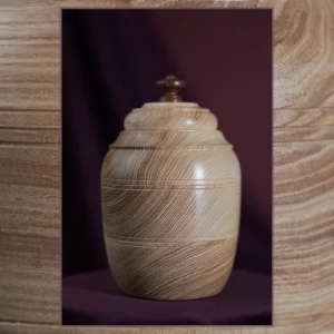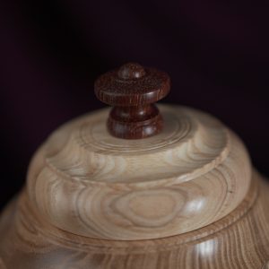 This exquisite pet urn will do the justice to your special friend and remind you of them in a dignified way, whenever you look back at it. Handmade of aesthetically pleasing Ash wood, the urn delights with its naturally eye-catching pattern. The artisan shape remains classic enough and it has been surmounted with a cross-resembling lid ornament made of exotic Wenge wood. The whole shines subtly thanks to our natural matt-finish.