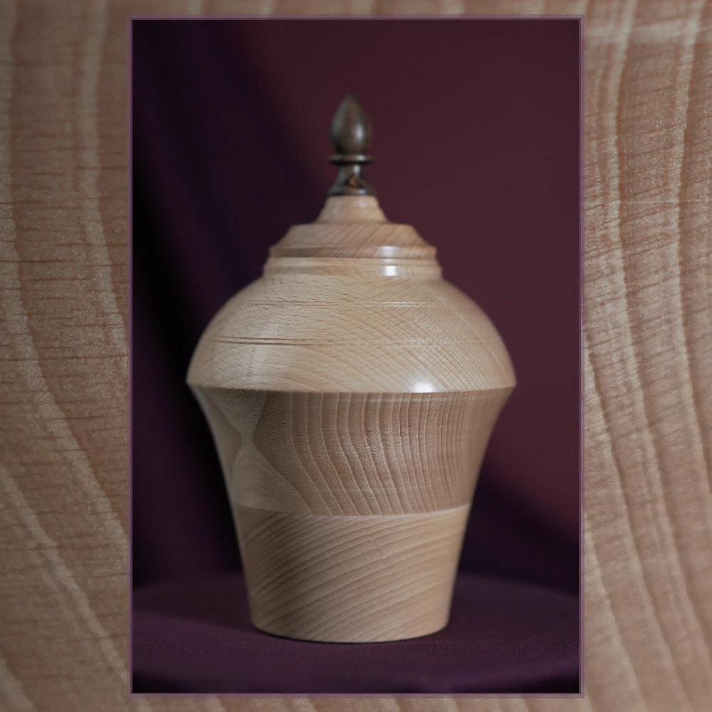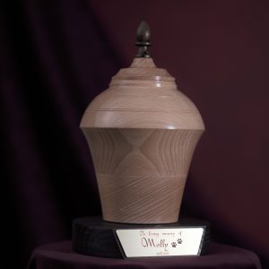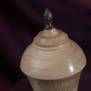 This modern pet urn will do the justice to your special friend and remind you of them in a dignified way, whenever you look back at it. Handmade of strong Beech wood, the urn captivates with a sophisticated form and a wood pattern that corresponds with it well. The modern design is beautifully emphatic, owing to its surmounting lid ornament made of Rosewood. First matt finished with oils and wax, then high shine polished.