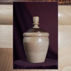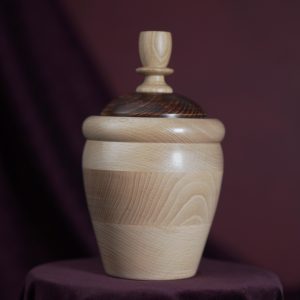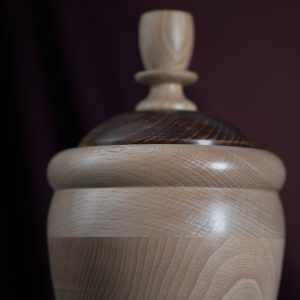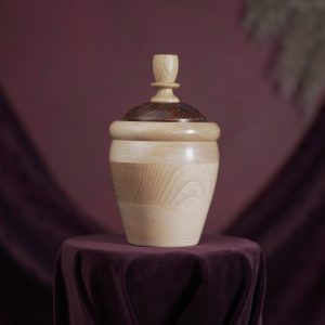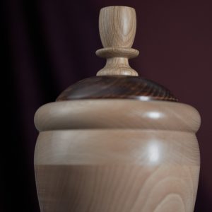 This modern pet urn will do the justice to your special friend and remind you of them in a dignified way, whenever you look back at it. Handmade of strong Beech wood, the urn delights with its pleasantly rounded apple shape and a gorgeous natural wood pattern. The artisan design has been completed with the stained lid and its beautiful ornament made of classic Oak. First matt finished with oils and wax, then high shine polished.